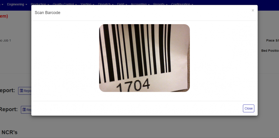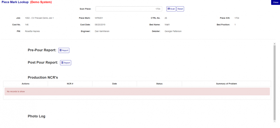 Once you've either entered or scanned a valid Piece Mark, the screen will show a summary of of the Piece information along with a couple reports, Production NCR's if available, and a Photo Log if available (Fig. 4).