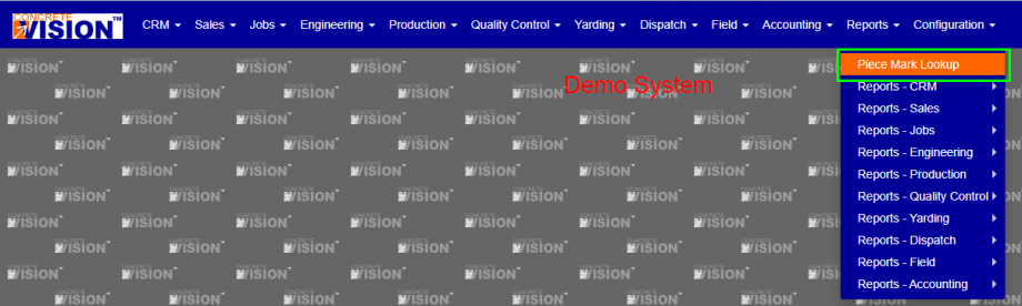 To look up a Piece Mark, First Navigate to the Piece Mark Lookup screen, which can be found under the Report menu as seen below (Green box in Fig. 1).