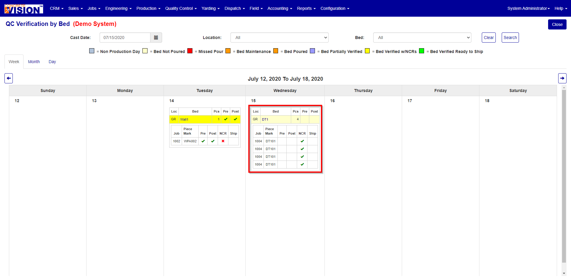 The section under the beds area is where you display the status of the piece marks for the bed in question. The columns after the piece mark columns display the status of the piece in Pre-Pour Check List, Post Pour Check List., if the Piece has a Open NCR and Preshipping Check List, , a blank columns means that it hasn’t started yet, a red x means that is has been started but hasn’t been completed and the a green check marks is displayed with everything is completed.