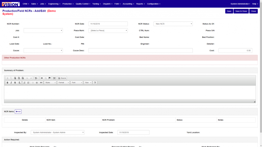 Once the Production NCR is open you will be able to edit the following fields.