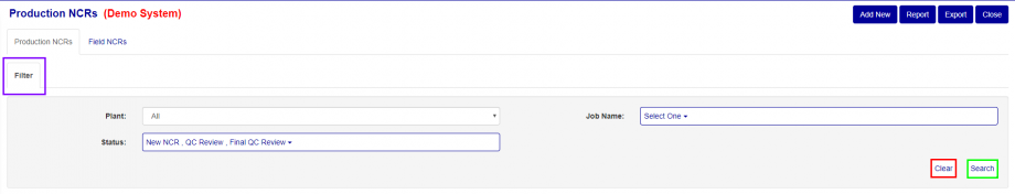 If you are unable to find the Production NCR that you are looking for. You can click on the filter tab (see Figure 2) which will display a list of fields you are filter the list by to narrow down you search. (see Figure 3). You can filter by Plant, Status and Job Name.