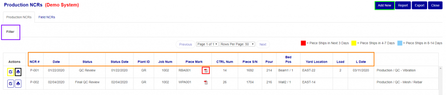 To customize the Production NCR list you see, you can edit the filter parameters to see specific Production NCR by using the Filter dropdown (Purple Box Fig. 2).