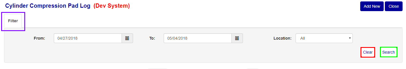 To add a Cylinder Compression Pad Test log, click the "add new" button (see the Green box in Figure 2).