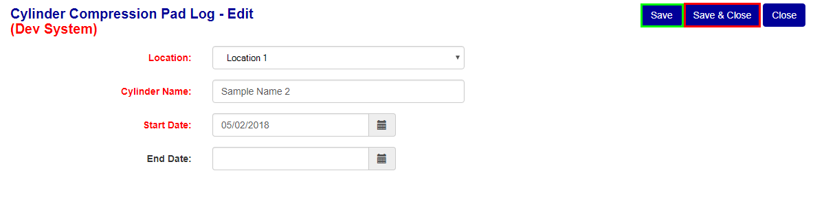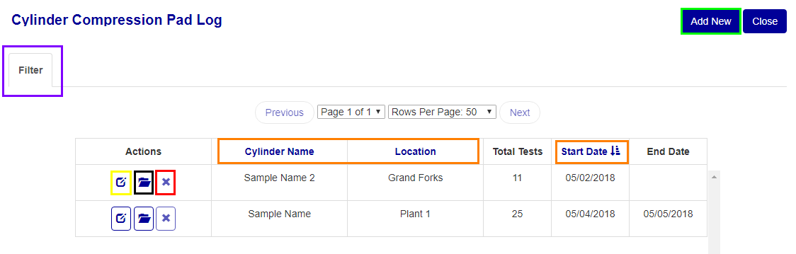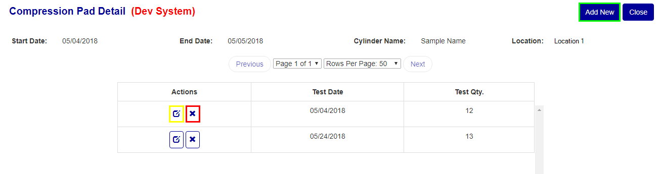 The Cylinder Compression Pad Log screen (see Figure 2) is where you can edit, add, and view Cylinder Compression Pad tests.