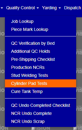 You access the Cylinder Compression Pad Log screen from the Quality Control menu, shown below.