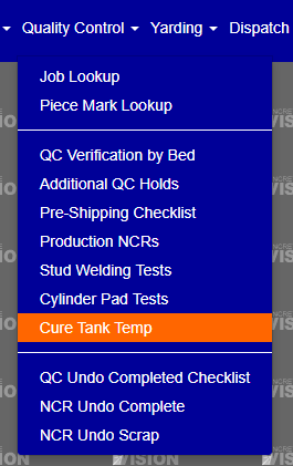 You access the Cure Tank Temp. Logs screen from the Quality Control menu, shown below.
