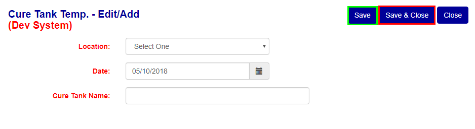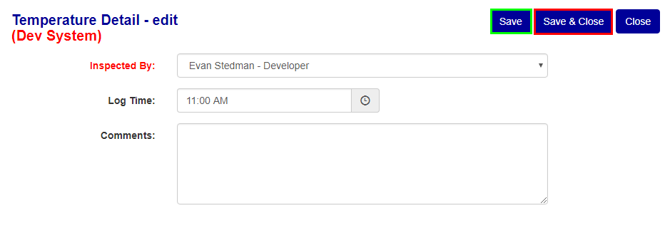 - To add the Temp. Log and migrate back to the main Temp. Log screen click the "save & close" button (see the Red box in Figure 4).