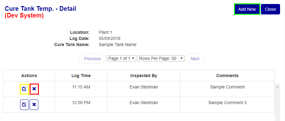 The Cure Tank Temp. Logs screen (see Figure 2) is where you can edit, add, and view Cure Tank Temp. logs.