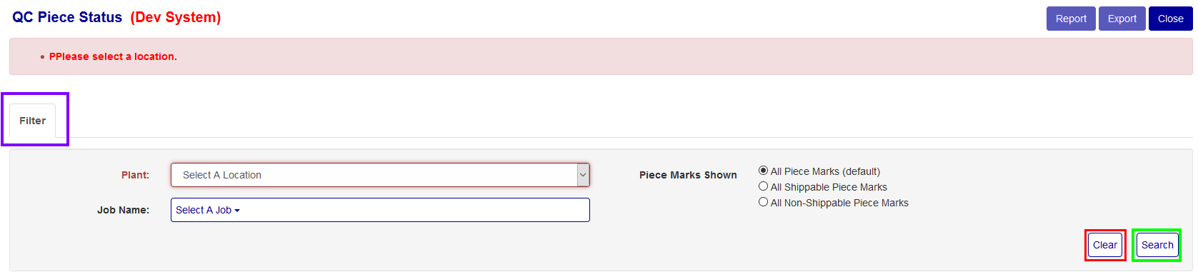 When you first open the page, you will not be able to use the “Report” or “Export” Buttons (Red box Fig. 2) until you use the filter (Purple box Fig. 2) to narrow down the values using the plant selector.