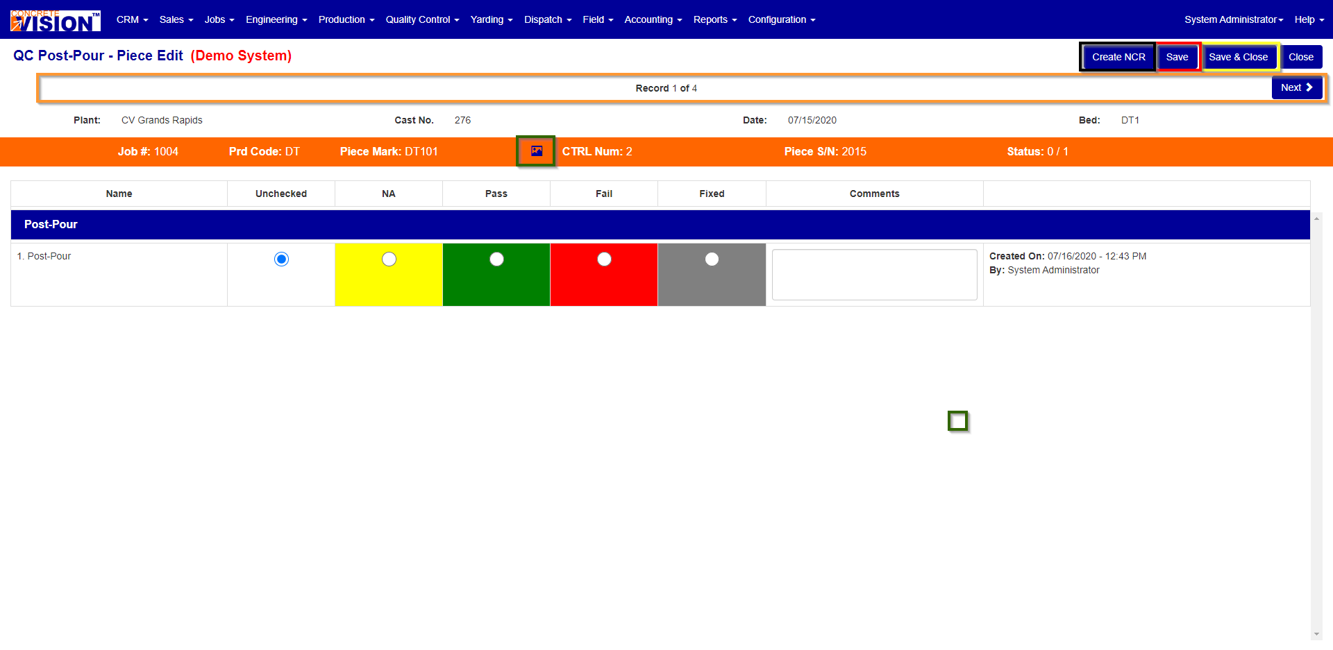 If there is a problem with the piece and you need to create a Production NCR, click on the Create NCR button (Black Box see Figure 4).