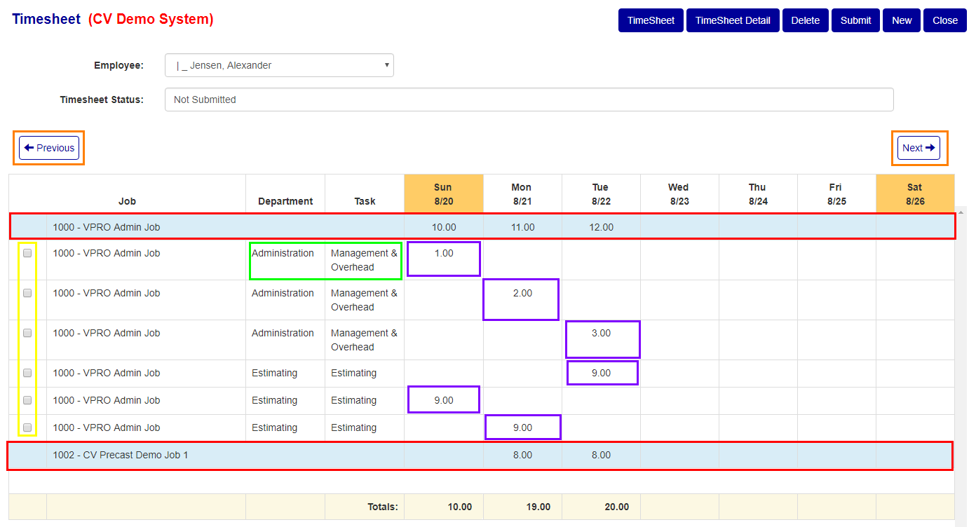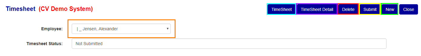 To open a tab to view either the summary or detailed time sheet for an employee press either the "Timesheet" or "Timesheet Detail" buttons accordingly (see Teal/Blue and Purple boxes in Figure 2).