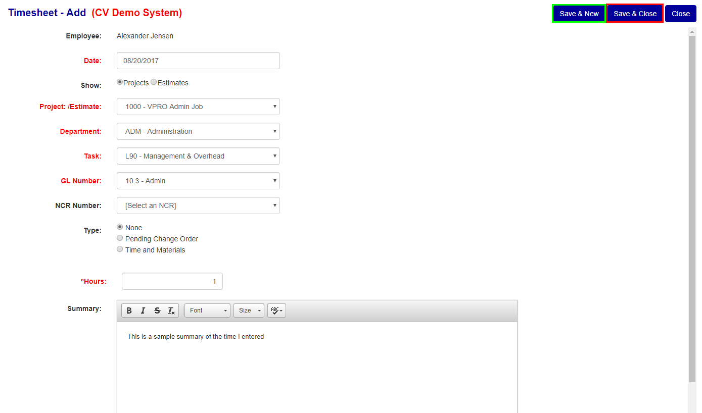 - Click the "Save & Close" button to add the time and move back to the employee time screen. (see the Red box in Figure 4)