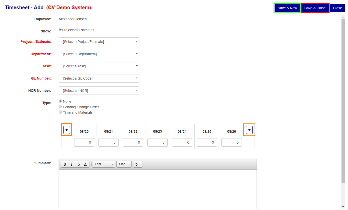 - Click the "Save & New" button to add the time and start a new time entry. (see the Green box in Figure 4)