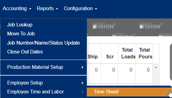 You access the Time Sheet screen from the Accounting > Employee Time and Labor sub-menu, shown below.
