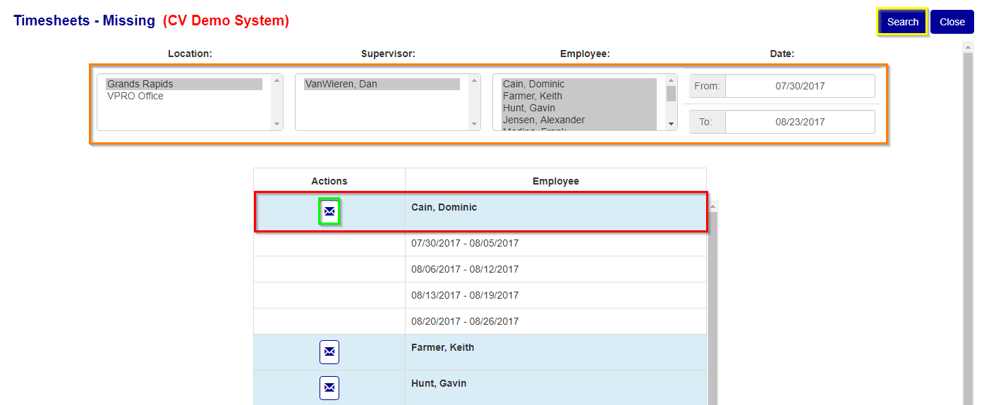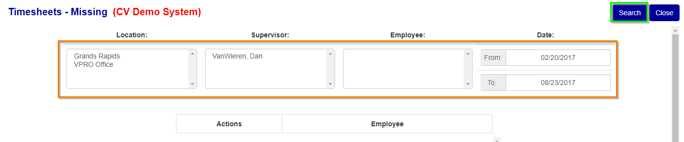 To search for missing timsheets, select the applicable items you want to search for at the top of the screen (see Orange box in Figure 2) and then clicking "search" (see Green box in Figure 2).