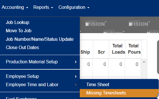 You access the Missing Timesheet screen from the Accounting > Employee Time and Labor sub-menu, shown below.