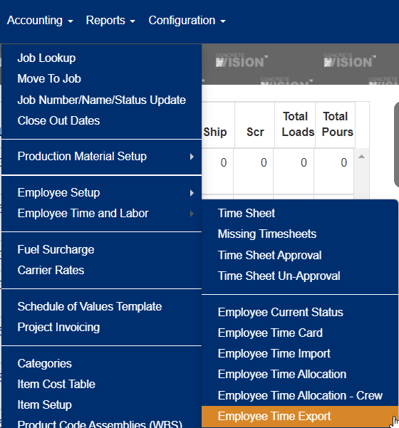 You access the Employee Time Export screen from the Accounting > Employee Time and Labor sub-menu, shown below.