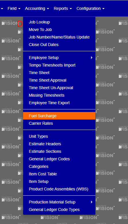 To get to the Fuel Surcharge screen, use the Accounting tab on the main menu at the top of the screen, then click on Fuel Surcharge (Figure 1 below).