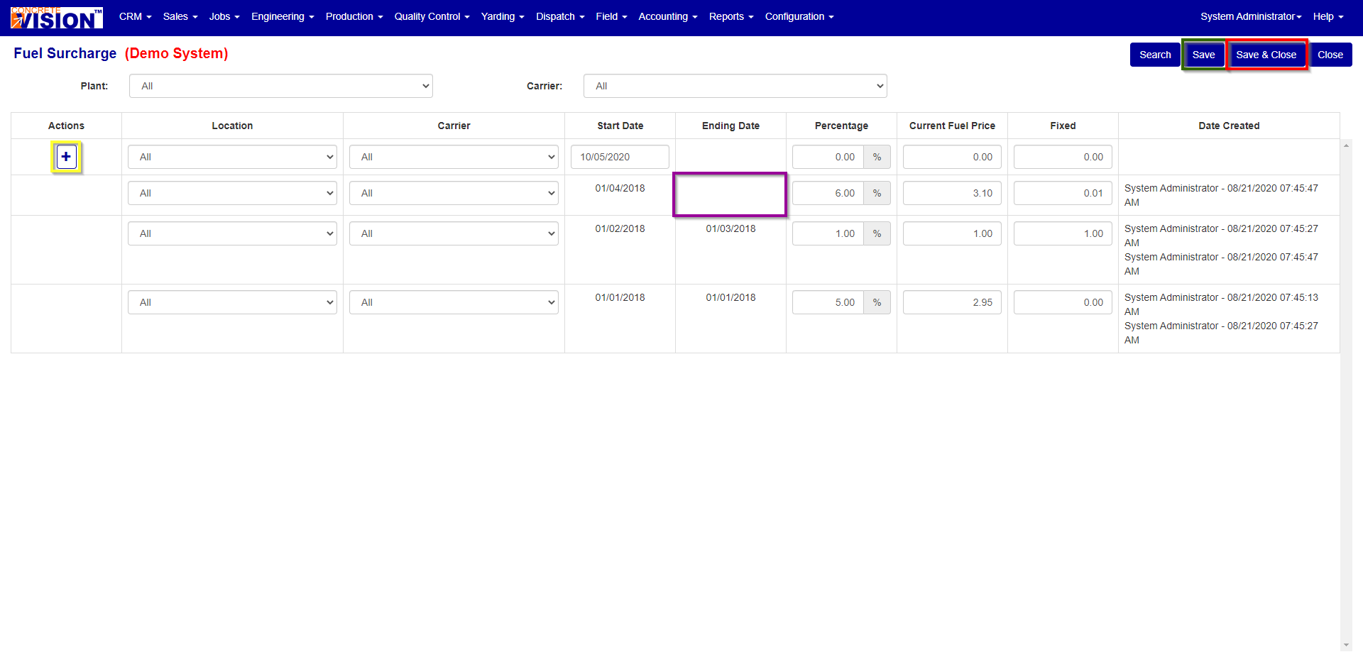 You can only edit the Location, Carrier, Percent, Current Fuel Price, and Fixed of a previous surcharge. To do so, change the field(s) corresponding to the row(s) you wish to adjust, then click the "Save" button (Green box in Figure 2) to save and return to the screen or the "Save & Close" button (Red box in Figure 2) to save and return to the main menu.