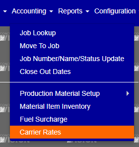 To get to the Carrier Rates screen, use the Accounting tab on the main menu at the top of the screen, then click on Carrier Rates (Figure 1 below).