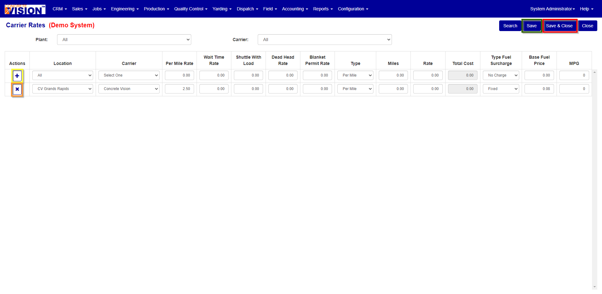 To edit carrier rates change the field(s) corresponding to the row(s) you wish to adjust, then click the "Save" button (Green box in Figure 2) to save and return to the screen or the "Save & Close" button (Red box in Figure 2) to save and return to the main menu.