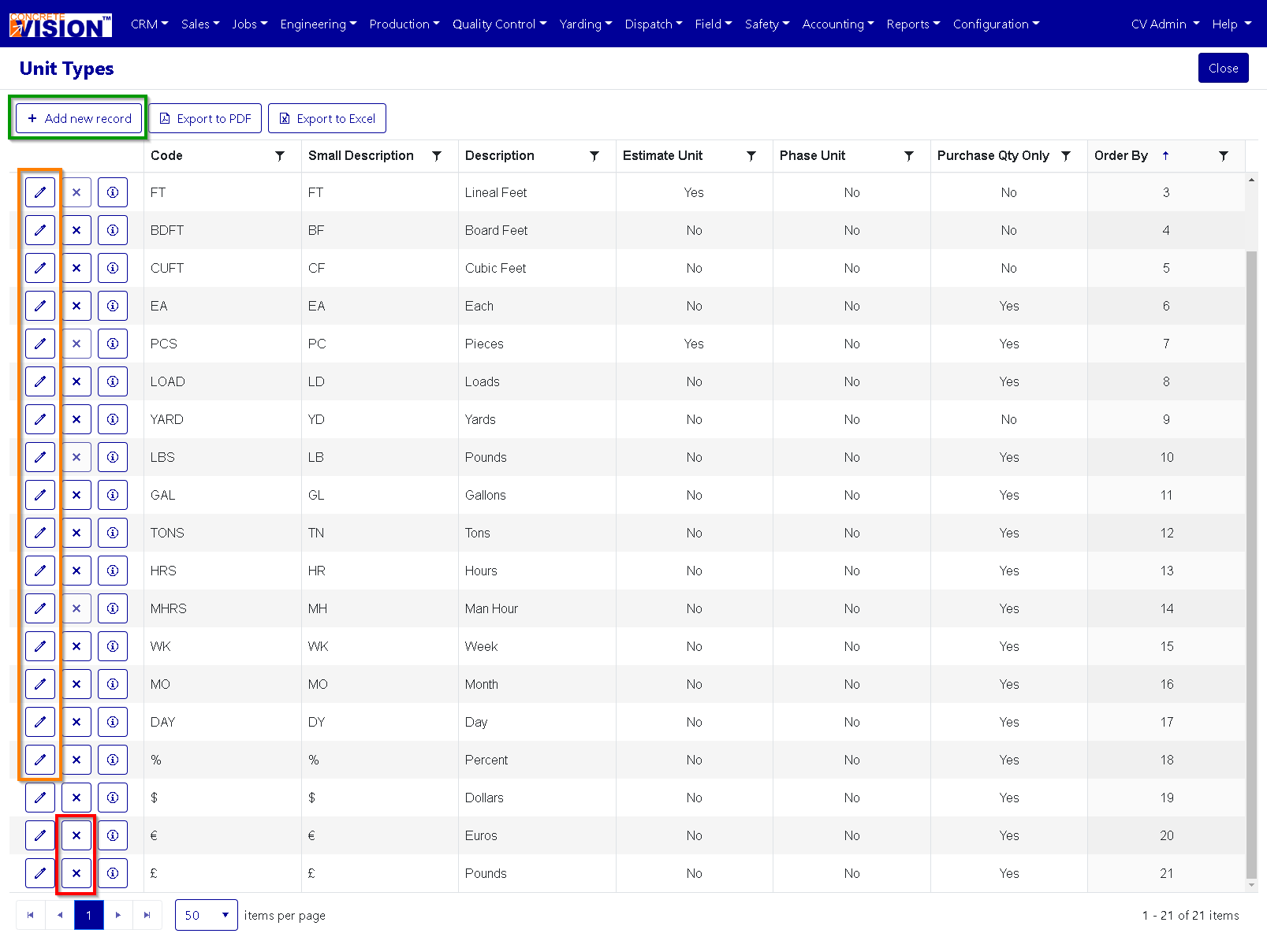The Unit Types module is where units of measure used throughout the Concrete Vision application are defined. Examples would include units of currency (Dollars, Euros and Pounds)(See Below Figure 2, Reference 1), units of time (Hours, Days, Months and Weeks), and units of weight (Pounds, Kilos and Tons).