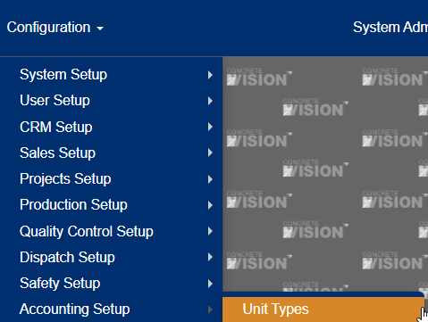 You access the Unit Types screen from the Configuration > Accounting Setup sub-menu, shown below.