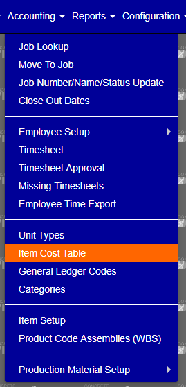 You access the Item Cost Table screen from the Accounting menu, shown below.