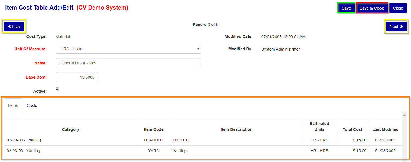 - To save the Item changes and return to the main Item Cost Tables click the "save & Close" button (see the Red box in Figure 5).