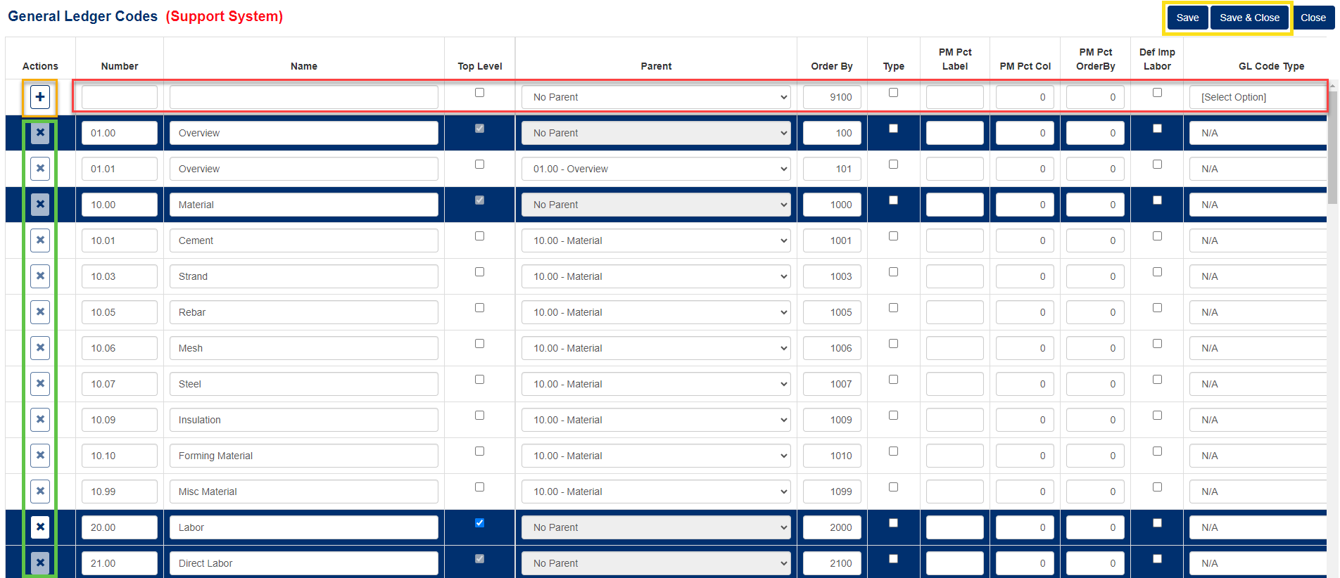 General Ledger Code Types are categories or types of accounts that GL Codes fall under. Each general ledger code has an optional code type. GL codes will tie back to estimates, labor, and material in Concrete Vision.