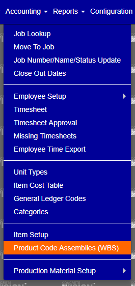 You access the Product Code Assemblies screen from the Accounting menu, shown below.