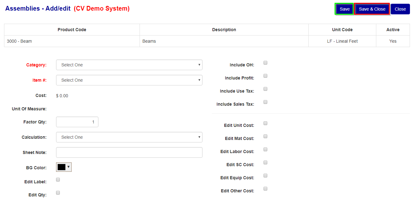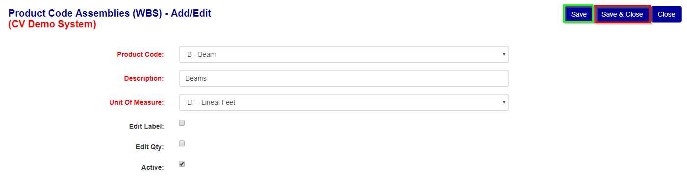 - To add the product code assembly and migrate back to the main screen click the "save & close" button (see the Red box in Figure 4).