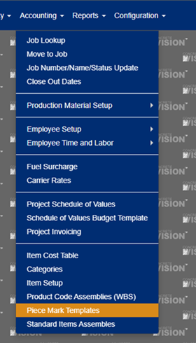 Navigate to Accounting > Piece Mark Templates in the main menu to access the Piece Mark Templates management interface.