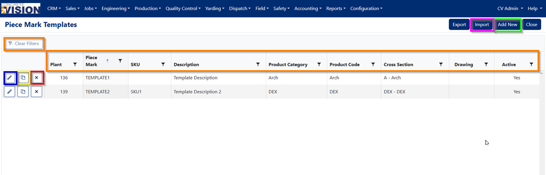 The Piece Mark Templates List screen displays all your current templates in a searchable table format. From this screen, you can: