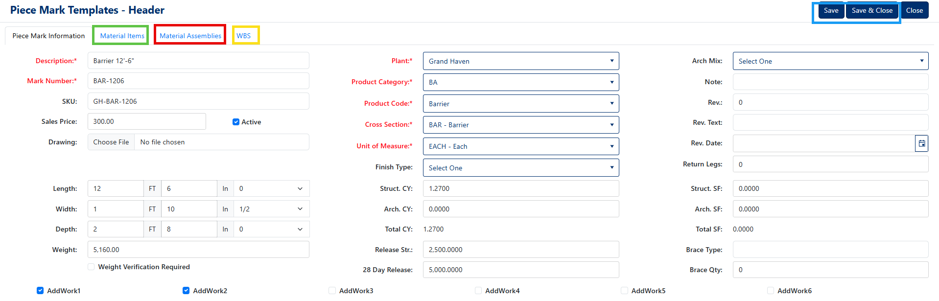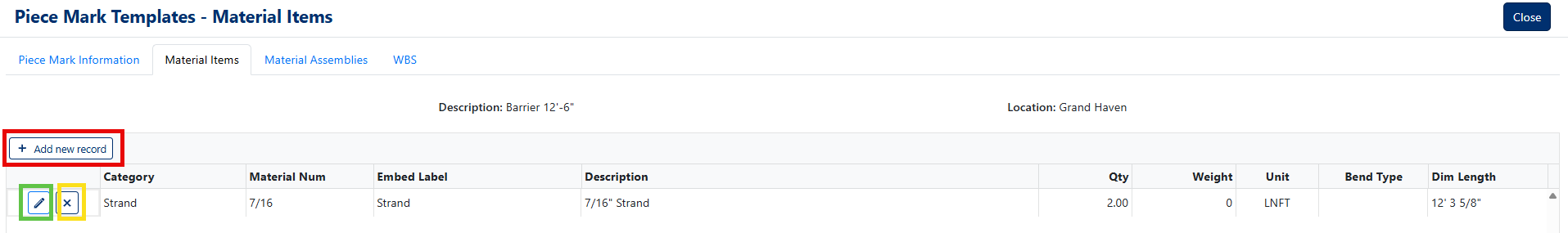 The Material Items tab allows you to specify individual materials required for the piece mark template.