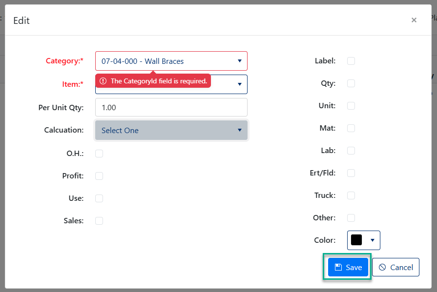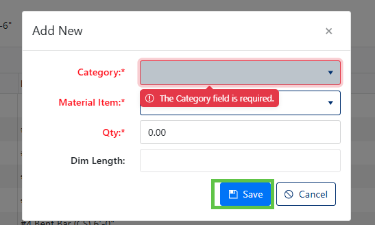 - Click Save to save new Material Item (Green box, Figure 9)