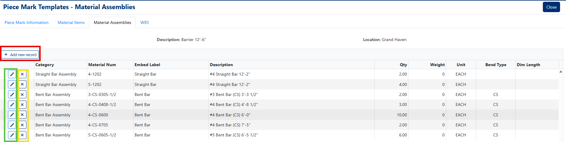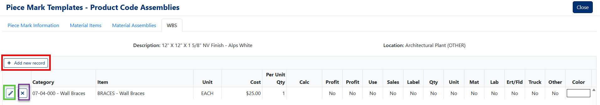 - Click the Edit button for the desired Material Assembly (Green box, Figure 8)