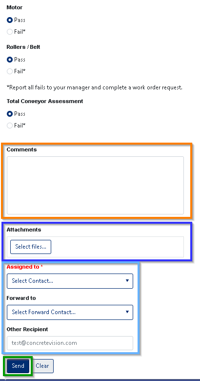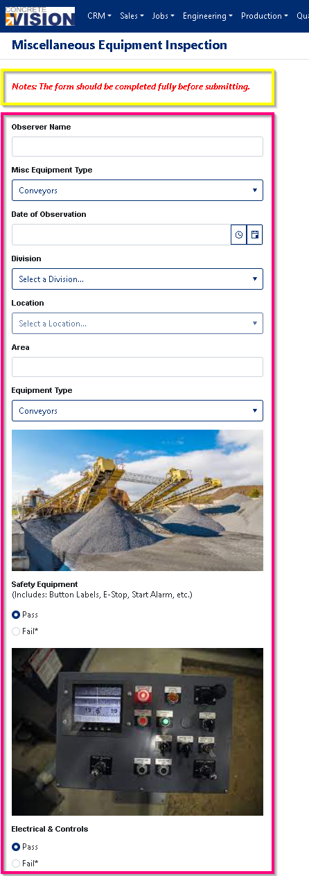 Safety Form Submission pages allow employees to document and report equipment inspections directly to Safety Team members. These forms help maintain workplace safety by ensuring regular equipment checks and creating a documented trail of all safety observations. When a safety concern is identified, the form facilitates quick communication to the appropriate personnel for remediation.