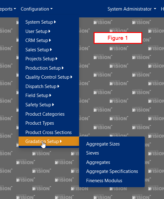 There are several configuration items that must be created before entering aggregate testing data. To add these items, access the Gradations Setup menu under Configuration. (Figure 1)