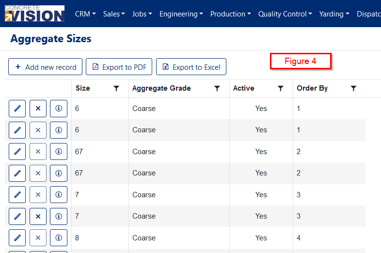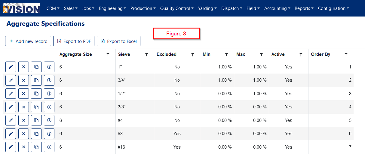 There may be many aggregate specifications for each aggregate size. In order to speed up data entry, you can copy an aggregate specification by clicking the Copy icon. You will then only need to change the Min and Max fields and possibly the Excluded checkbox (Figure 10).