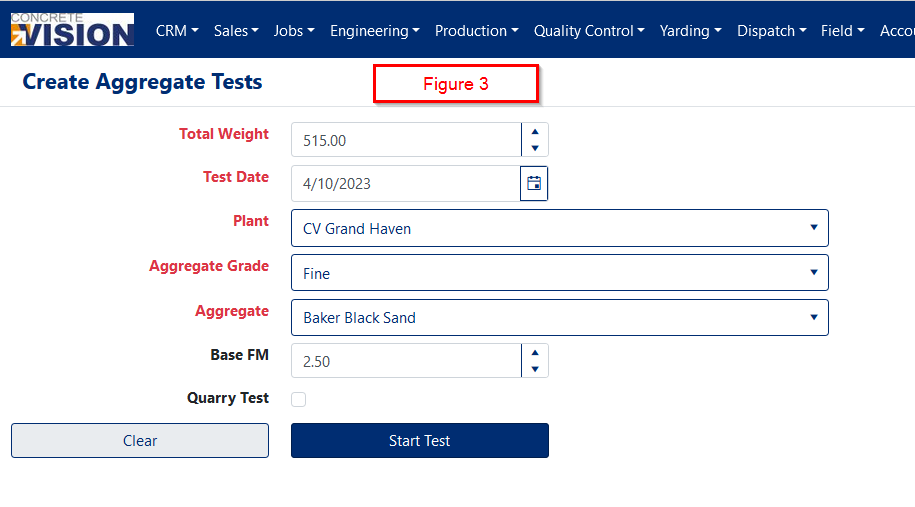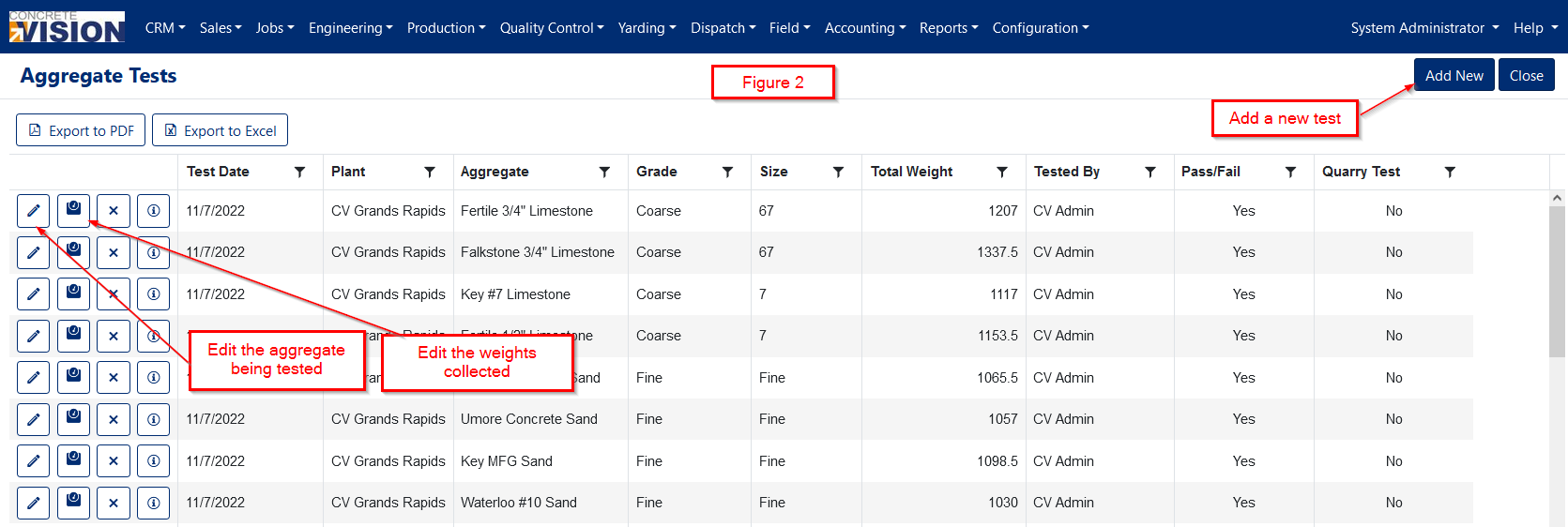 Aggregate tests can either be based on data collected at your plant or supplied by the quarry. Each aggregate can only have one quarry test. If new data is supplied by the quarry, edit the existing test.