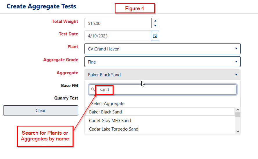 The dropdown lists for Plant and Aggregate are searchable. (see Figure 4 below)