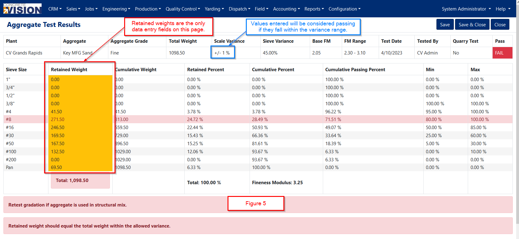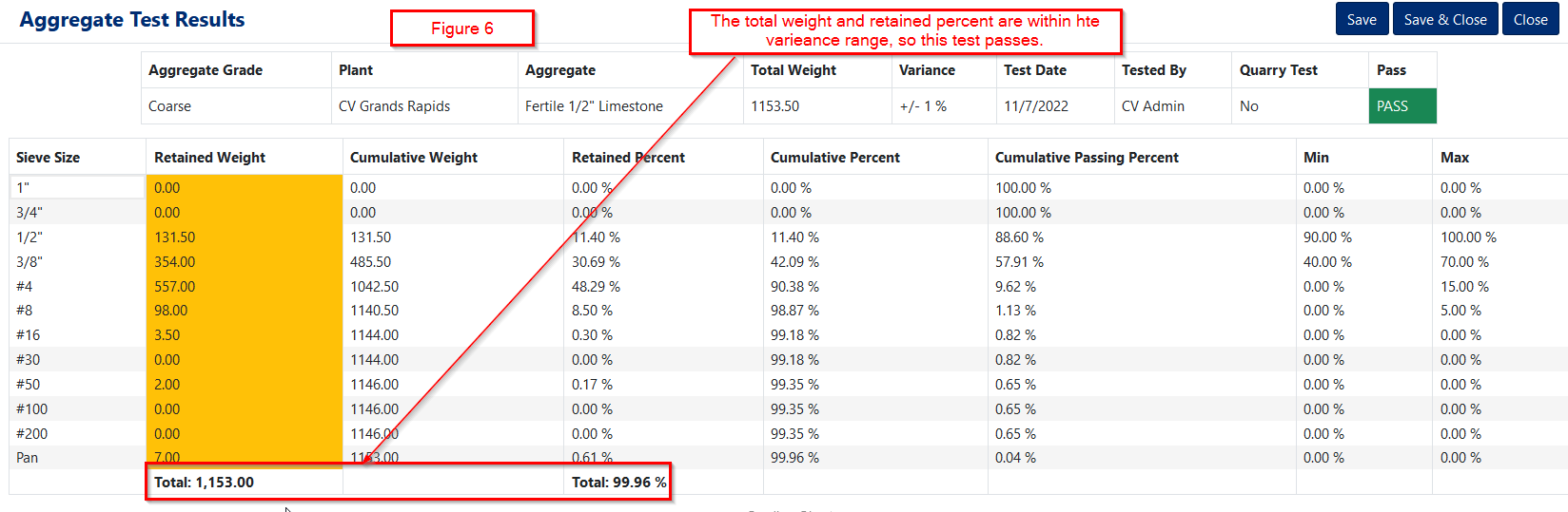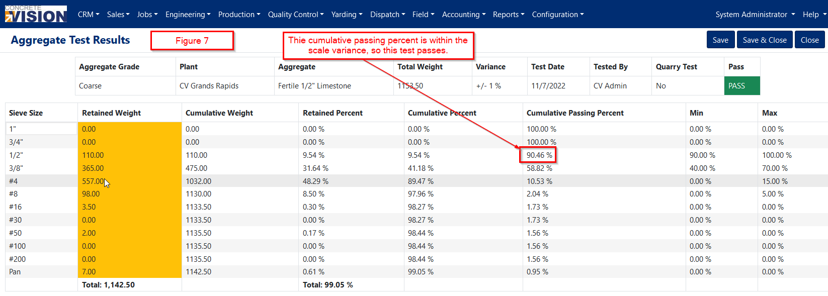 Scale variance gives you a +/- range where a value within that range but outside of the spec will still pass. The variance applies to the Cumulative Passing Percent and Total Retained Weight (Figure 6).