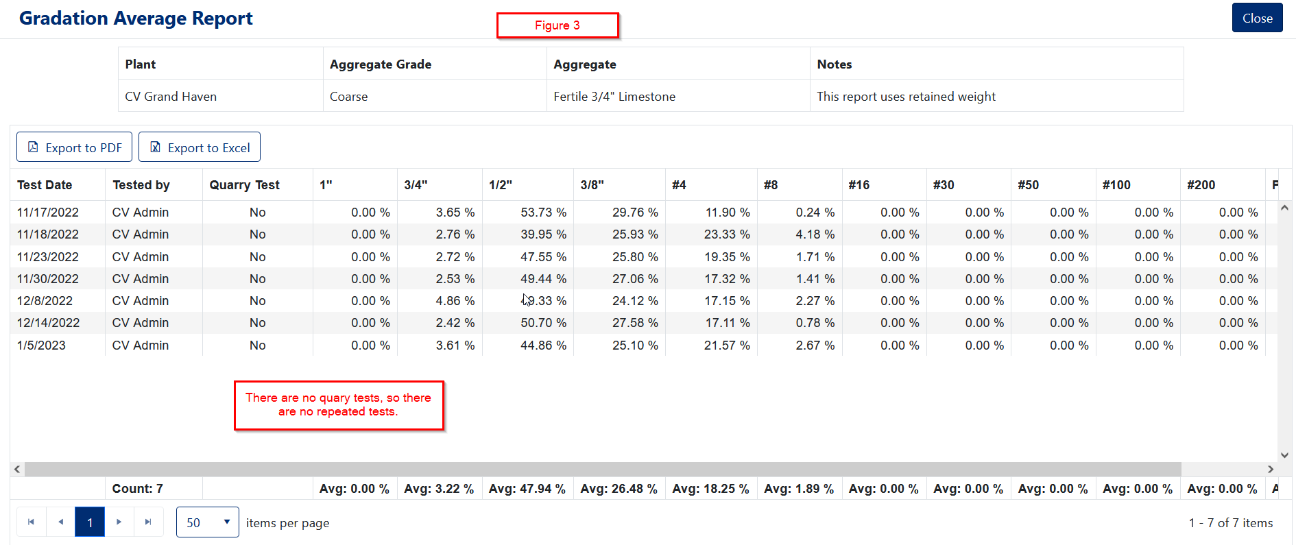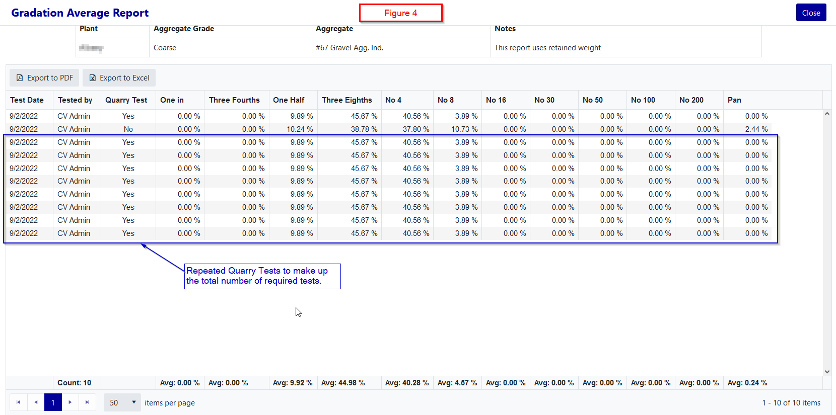This report allows you to report on aggregate test results over time. You can run the report for more tests than you may have in the system for a given date range, to spread the average over a larger number of tests. If a quarry test is available, this is the test that is repeated in order to reach the required number of tests. If there is no quarry test, and the number of tests is less than the total tests entered, there will be no repeated tests.