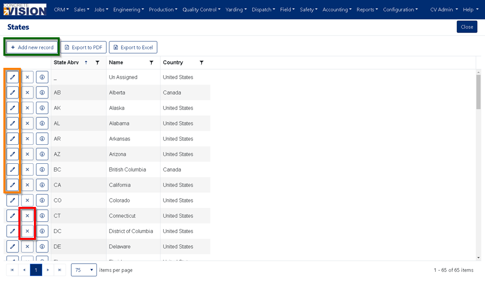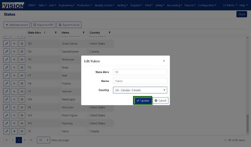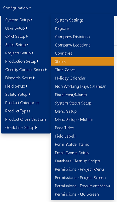 The States module is where states are defined and managed. These defined states are used throughout the Concrete Vision application as options which can be selected. Example uses for these defined states include adding locations for contacts, plants and project contacts.