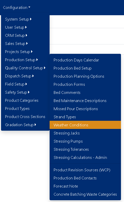 You access the Weather Conditions screen from the Configuration -> Production Setup menu, shown below.