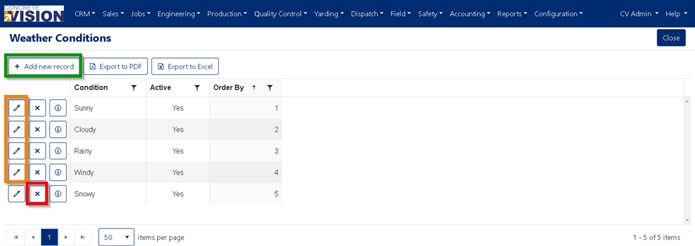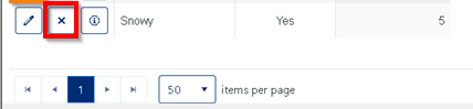 - Click the "delete" button in the corresponding row of the Weather Condition you wish to remove (see Red box in Figure 5). Please note: You cannot delete a Weather Condition if it is in use