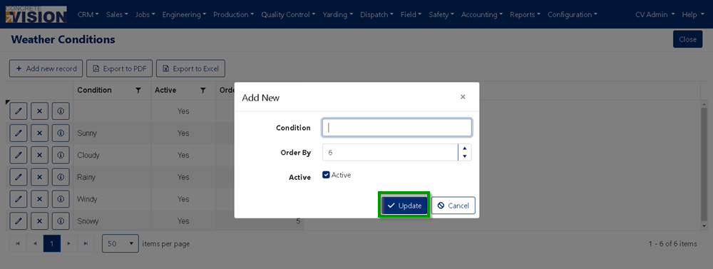 - Click on the “Update” button to Add the new Weather Condition (see the Green box in Figure 4).