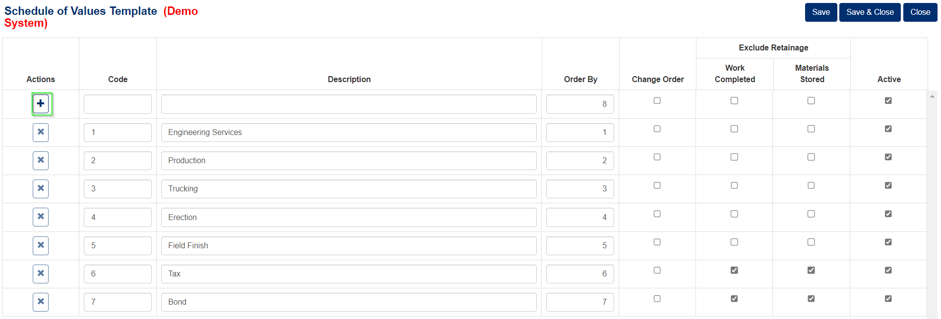 To Edit an item on the Schedule of Values Template, the data in the corresponding row to be adjusted, then press either the Save or Save & Close button at the top of the screen.