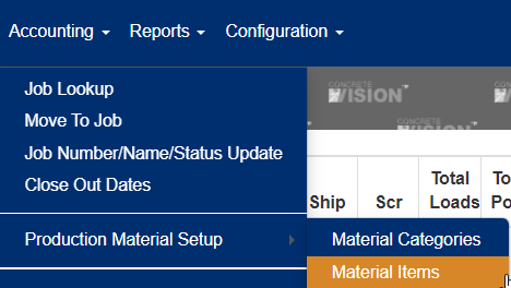 You can access the Materials Items setup screen from "Accounting > Production Material Setup > Material Items," as shown below: